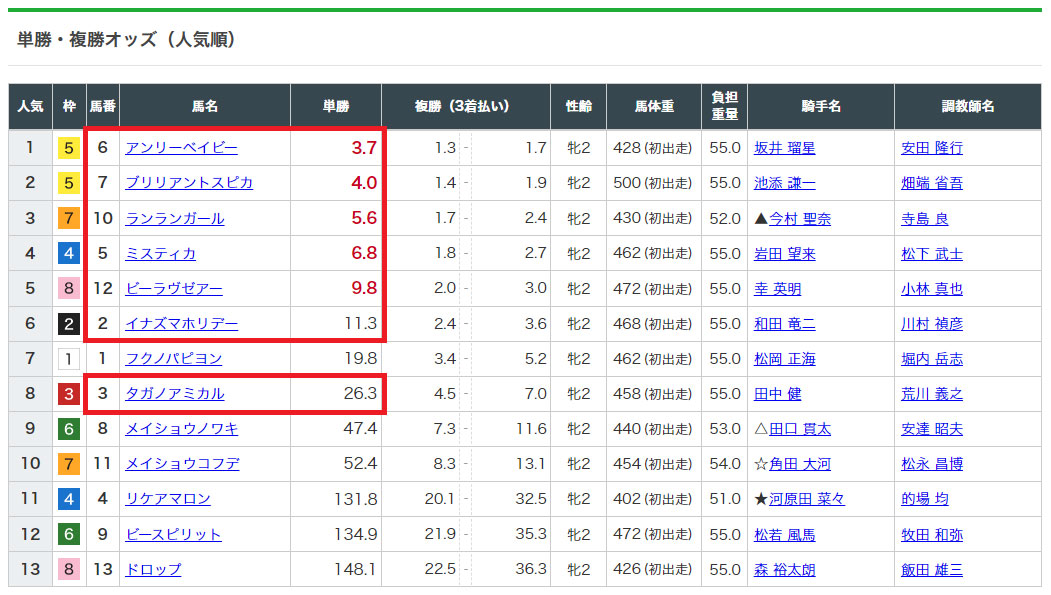 1~6番人気馬と8番人気馬の上位人気を中心とした買い目。