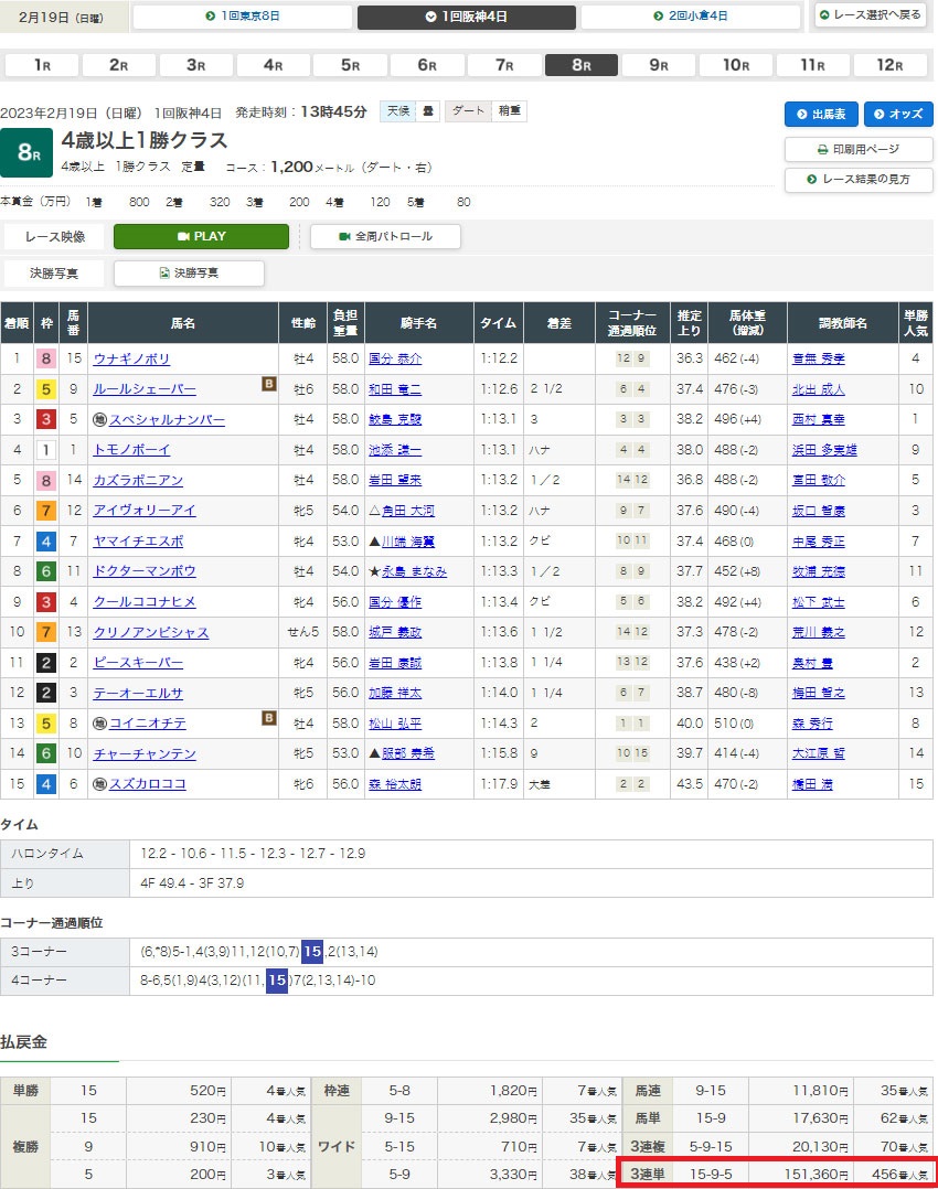 2月18日・阪神9レース つばき賞 3歳1勝クラス 芝1800m