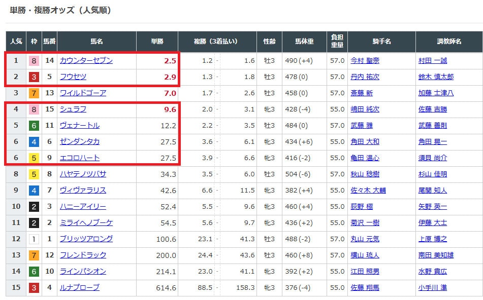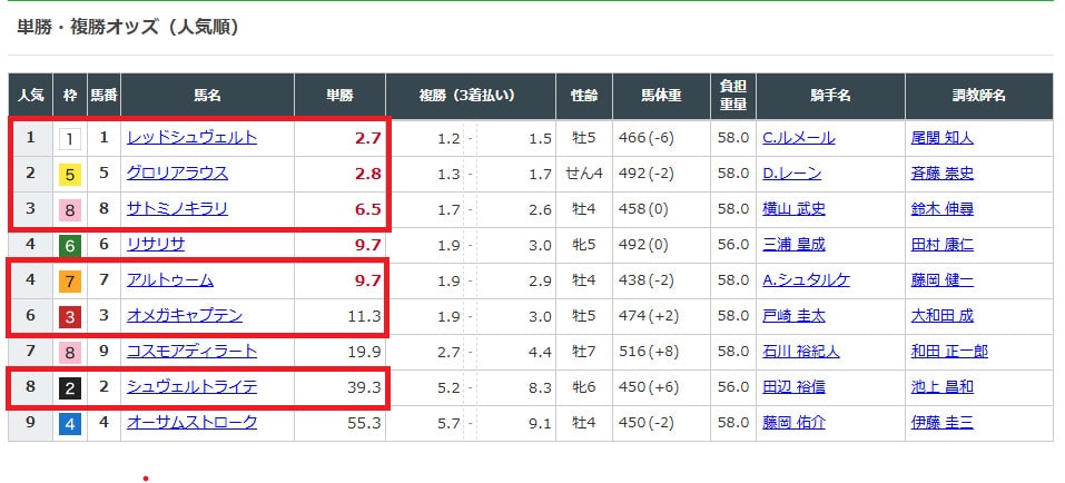 3番人気の⑬以外の上位人気馬を中心とした予想になりますね。