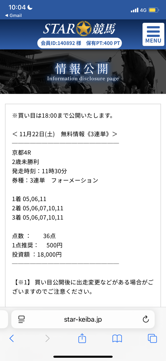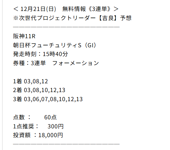 今朝、オススメされた初めだし無料情報から試してみようと思い 公開されていた3連単買い目を推奨通りに馬券購入。 そしたら初回から3連単万馬券(309.6倍)的中いただけました! ビックリしましたがオススメする理由が無料予想からも理解できました。 1点500円で馬券を購入していたので15万4800円! 明日はマイルチャンピオンの予想公開されるみたいなので楽しみに買い目公開を待ちたいと思います。 先週もエリザベス女王杯3連単予想で7万4040円的中させていたのもうなずけます。