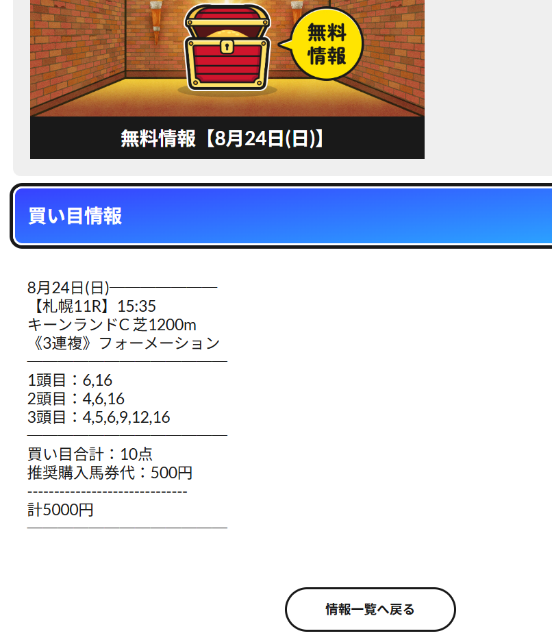 キーンランドカップの予想6・16から完璧でしたね! さすがの予想あざました! 夏競馬はリホラボで乗り越えました! ・払戻金額/28,900円 ・回収率/578% 無料情報でこの数値は申し分なしですね!!